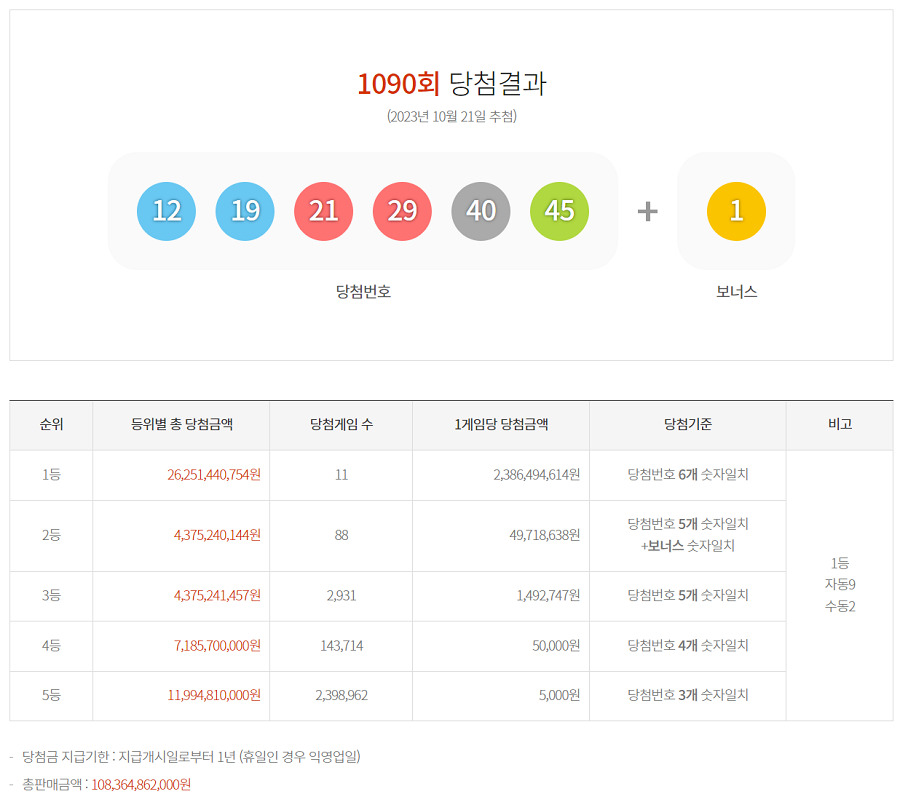 1090회 로또 당첨번호 / 당첨금액 / 당첨 게임 안내