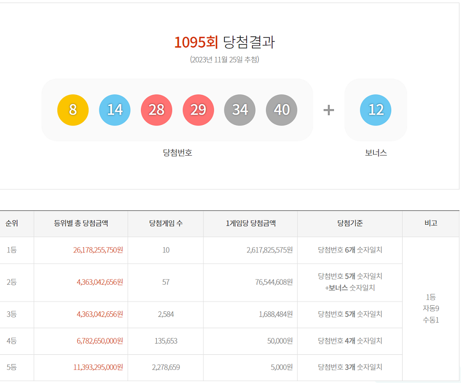 1095회 당첨 로또 번호 및 당첨금액 및 당첨 게임 안내