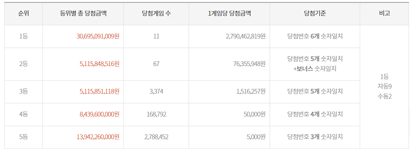 2등 : 당첨번호 5개 숫자일치 + 보너스 숫자일치
