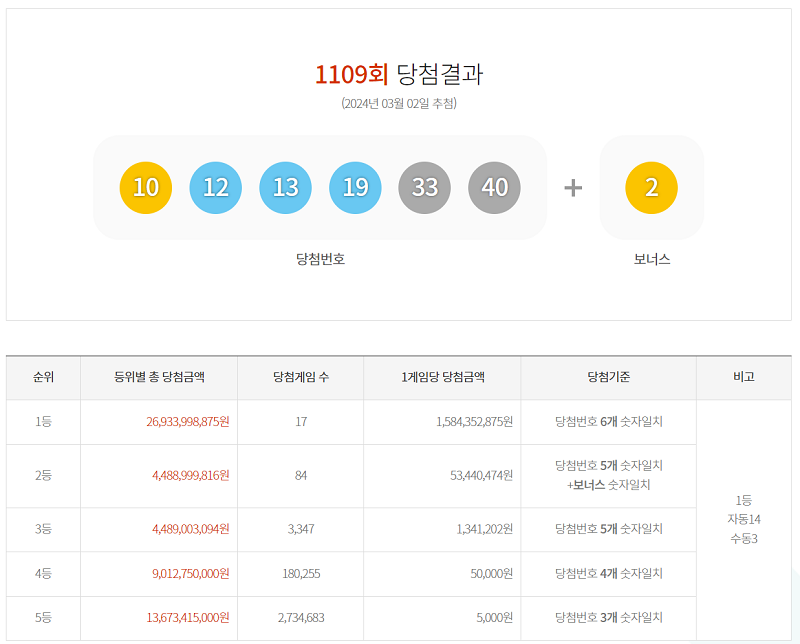 1109회 당첨 로또 번호 및 당첨금액 및 당첨 게임 안내