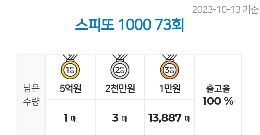 - 스피또1000 73회 출고율 / 스피또1000 73회 당첨현황(2023.10.13 기준)