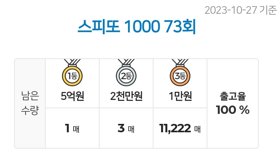 - 스피또1000 73회 출고율 / 스피또1000 73회 당첨현황(2023.10.27 기준)