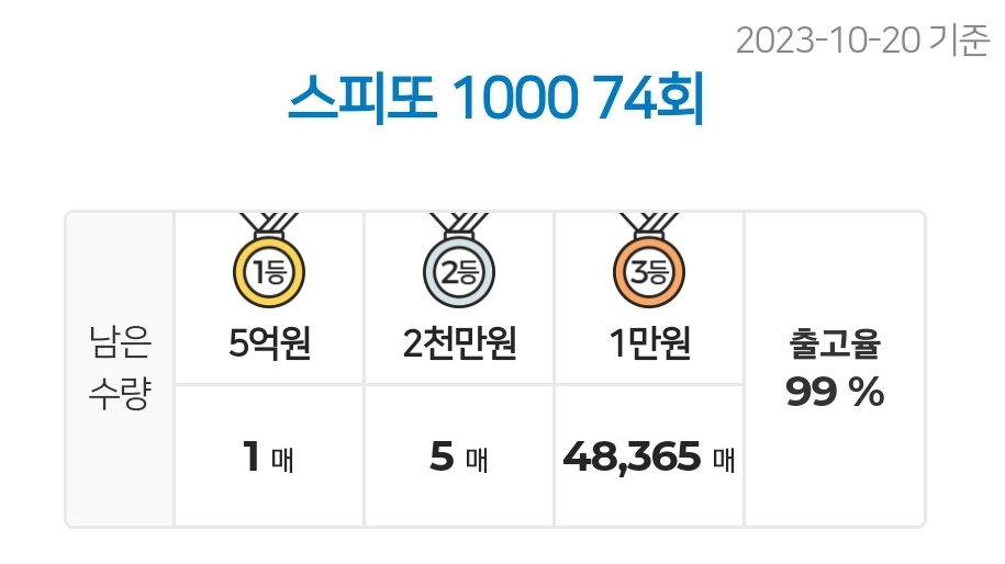 - 스피또1000 74회 출고율 / 스피또1000 74회 당첨현황(2023.10.20 기준)