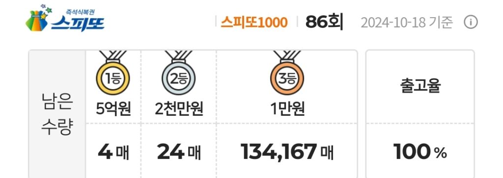 스피또1000 86회 1등 남은 수량 출고율 정보 및 당첨현황 정보입니다.