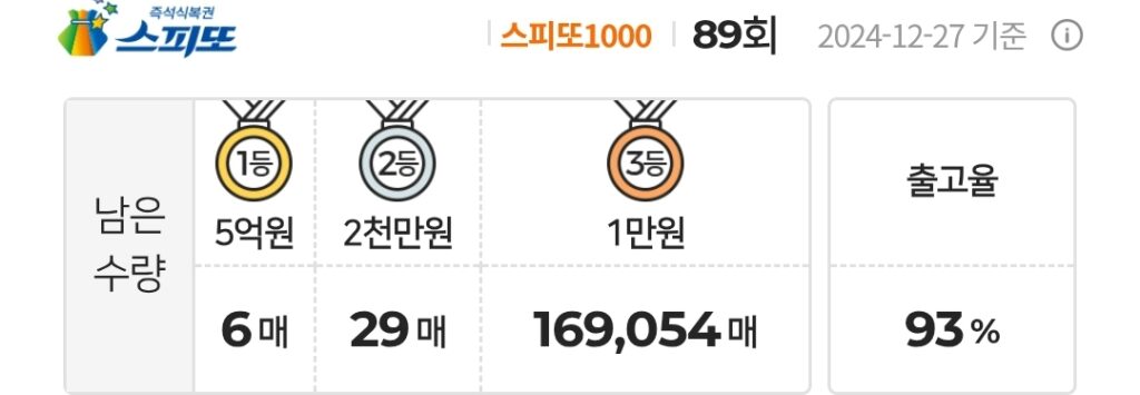 스피또1000 복권 89회 남은수량 1등 6매(총 9매 중), 2등 29매(총 45매 중), 3등 169,054매(총 247,500매 중)가 남아 있습니다. 출고율(판매점 입고율)은 93%입니다. 출고율의 의미와 당첨확률을 높이는 방법은 스피또 당첨확율을 높이는 방법은? 구입전에 출고율과 남은 수량을 확인은 필수! 포스팅을 참고하세요.
