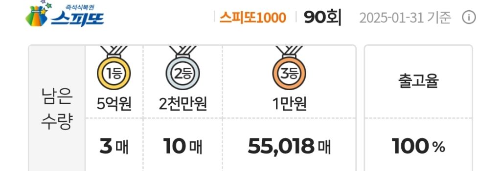 스피또1000 복권 90회 남은수량 1등 3매(총 6매 중), 2등 10매(총 30매 중), 3등 55,018매(총 165,000매 중)가 남아 있습니다. 출고율(판매점 입고율)은 100%입니다. 출고율의 의미와 당첨확률을 높이는 방법은 스피또 당첨확율을 높이는 방법은? 구입전에 출고율과 남은 수량을 확인은 필수! 포스팅을 참고하세요.
