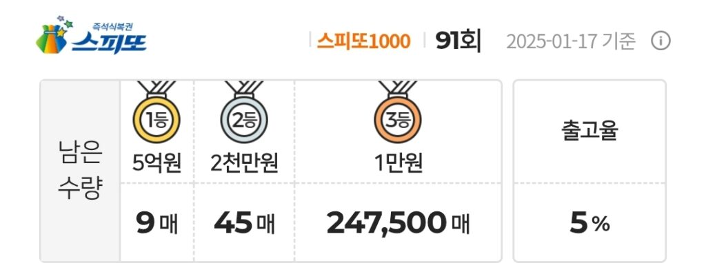 스피또1000 복권 91회 남은수량 1등 9매(총 9매 중), 2등 45매(총 45매 중), 3등 247,500매(총 247,500매 중)가 남아 있습니다. 출고율(판매점 입고율)은 5%입니다. 출고율의 의미와 당첨확률을 높이는 방법은 스피또 당첨확율을 높이는 방법은? 구입전에 출고율과 남은 수량을 확인은 필수! 포스팅을 참고하세요.