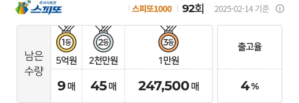 스피또1000 복권 92회 남은수량 1등 9매(총 9매 중), 2등 45매(총 45매 중), 3등 247,500매(총 247,500매 중)가 남아 있습니다. 출고율(판매점 입고율)은 4%입니다. 출고율의 의미와 당첨확률을 높이는 방법은 스피또 당첨확율을 높이는 방법은? 구입전에 출고율과 남은 수량을 확인은 필수! 글을 참고하세요.