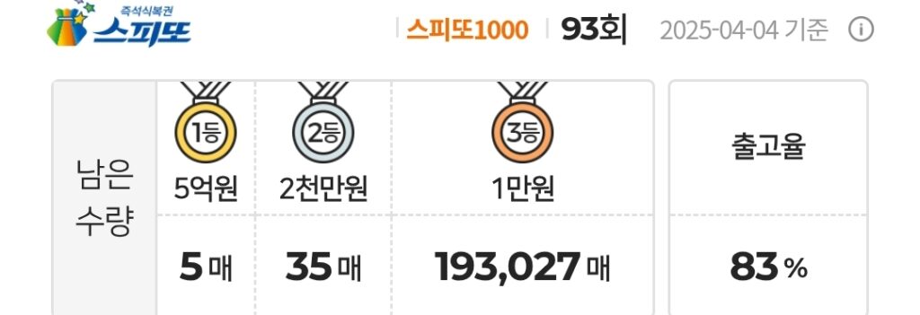 스피또1000 복권 93회 남은수량 1등 5매(총 9매 중), 2등 35매(총 45매 중), 3등 193,027매(총 247,500매 중)가 남아 있습니다. 출고율(판매점 입고율)은 83%입니다. 출고율의 의미와 당첨확률을 높이는 방법은 스피또 당첨확율을 높이는 방법은? 구입전에 출고율과 남은 수량을 확인은 필수! 글을 참고하세요.