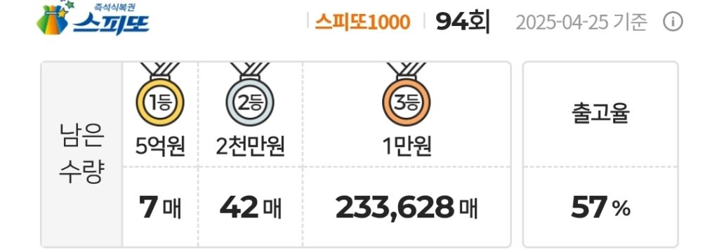 스피또1000 94회 출고율(판매점 입고율) / 스피또1000 94회 당첨현황(2025.04.28기준)