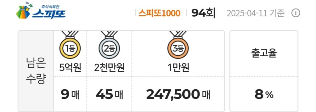 스피또1000 94회 출고율(판매점 입고율) / 스피또1000 94회 당첨현황(2025.04.13기준)