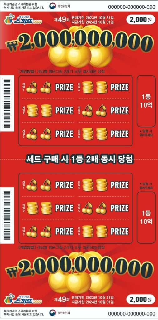스피또2000은 세트로(4,000원) 구매시 1등 2매 동시에 당첨됩니다.