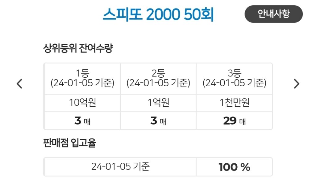 스피또2000 즉석복권 50회 남은수량 1등 3매(총 6매 중), 2등 3매(총 18매 중), 3등 29매(총 150매 중)가 남아있습니다. 출고율(판매점 입고율)은 100%입니다. 1등,2등,3등 모두 아직 당첨자가 나오지 않았습니다. 출고율의 의미와 당첨확률을 높이는 방법은 스피또 당첨확율을 높이는 방법은? 구입전에 출고율과 남은 수량을 확인은 필수! 포스팅을 참고하세요.