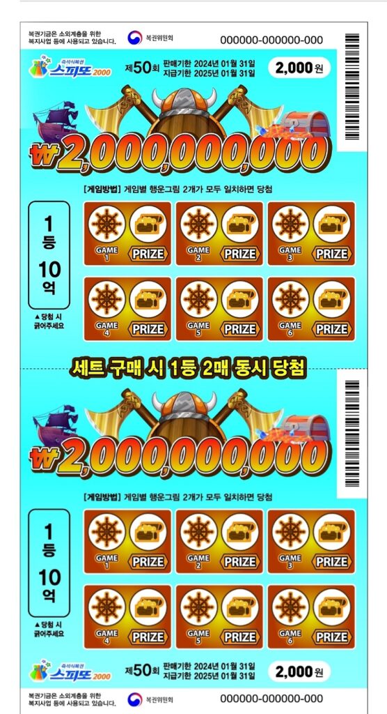 스피또2000은 세트로(4,000원) 구매시 1등 2매 동시에 당첨됩니다.