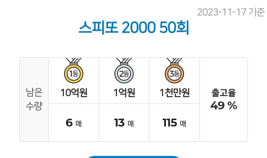 스피또2000 50회 출고율 / 스피또2000 50회 당첨현황(2023.11.17 기준)