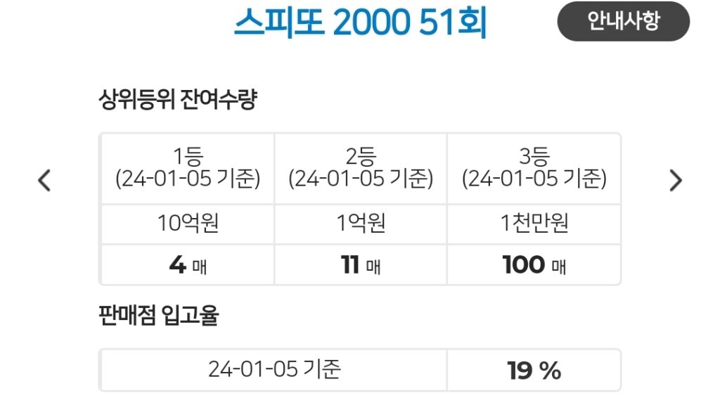 스피또2000 즉석복권 51회 남은수량 1등 4매(총 4매 중), 2등 11매(총 12매 중), 3등 100매(총 100매 중)가 남아있습니다. 출고율(판매점 입고율)은 19%입니다. 1등,2등,3등 모두 아직 당첨자가 나오지 않았습니다. 출고율의 의미와 당첨확률을 높이는 방법은 스피또 당첨확율을 높이는 방법은? 구입전에 출고율과 남은 수량을 확인은 필수! 포스팅을 참고하세요.