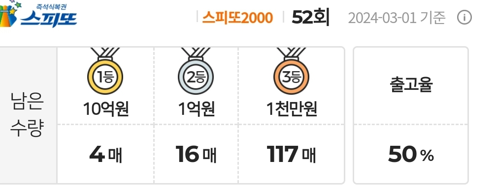 스피또2000 즉석복권 52회 남은수량 1등 4매(총 6매 중), 2등 16매(총 18매 중), 3등 117매(총 150매 중)가 남아있습니다. 출고율(판매점 입고율)은 50%입니다.