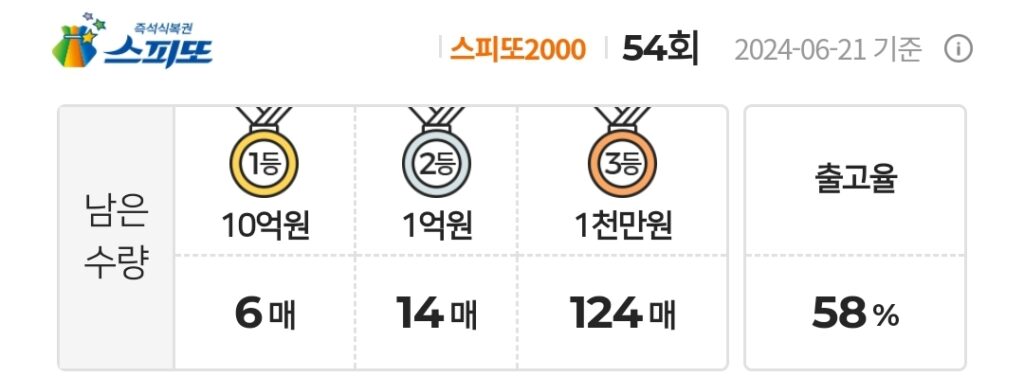 스피또2000 즉석복권 54회 남은수량 1등 6매(총 6매 중), 2등 14매(총 18매 중), 3등 124매(총 150매 중)가 남아있습니다. 출고율(판매점 입고율)은 58%입니다.
