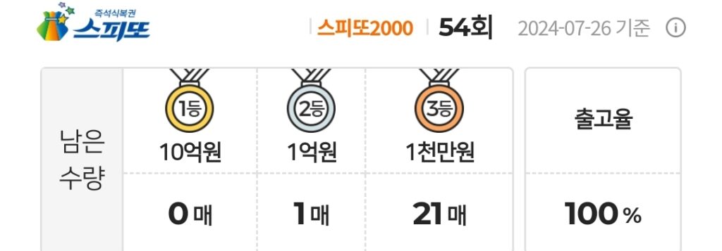 스피또2000 즉석복권 54회 남은수량 1등 0매(총 6매 중), 2등 1매(총 18매 중), 3등 21매(총 150매 중)가 남아있습니다. 출고율(판매점 입고율)은 100%입니다.