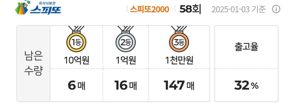 스피또2000 즉석복권 58회 남은수량 1등 6매(총 8매 중), 2등 16매(총 18매 중), 3등 147매(총 150매 중)가 남아있습니다. 출고율(판매점 입고율)은 32%입니다.