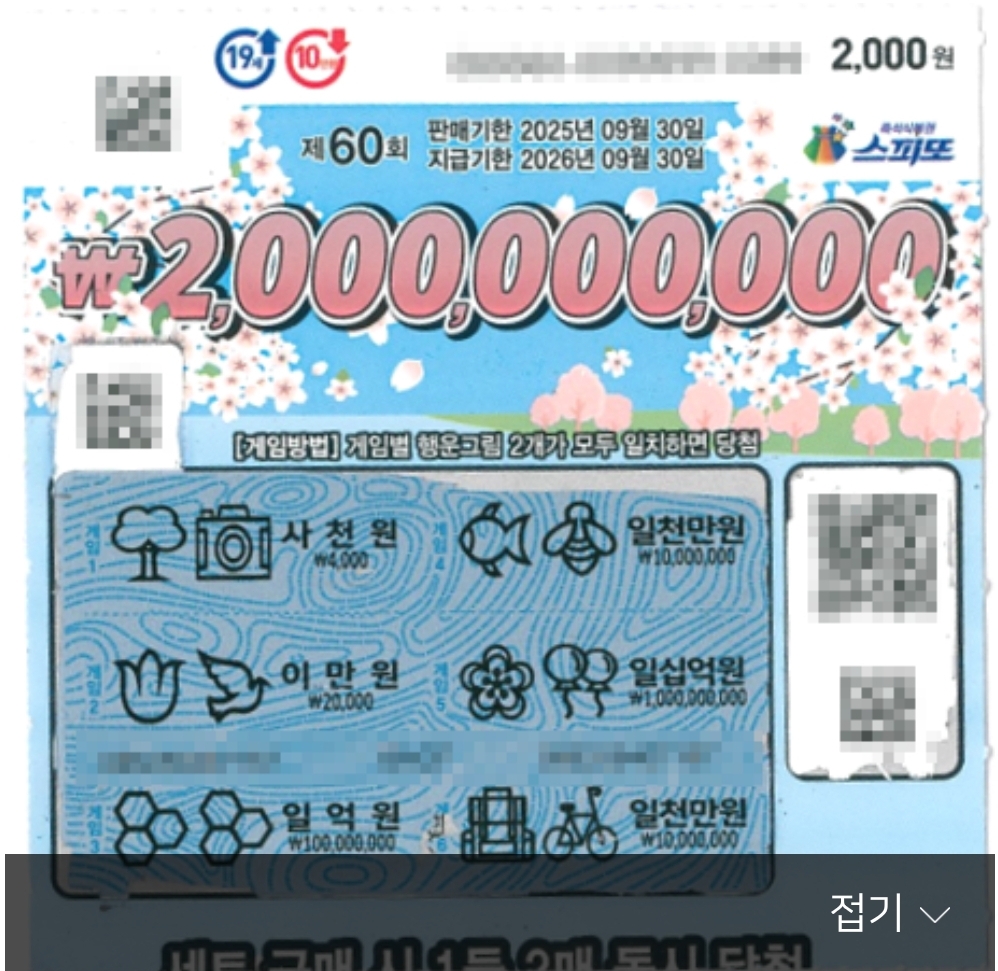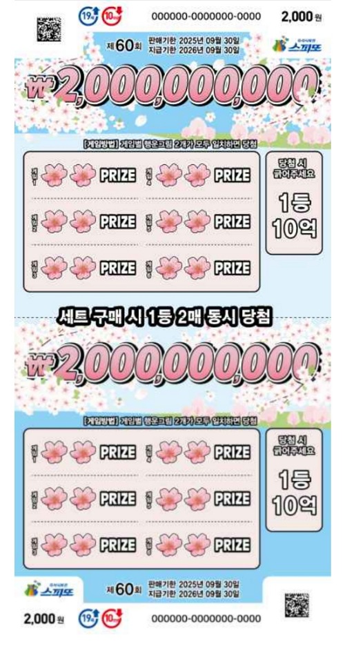 스피또2000은 세트로(4,000원) 구매시 1등 2매 동시에 당첨됩니다.