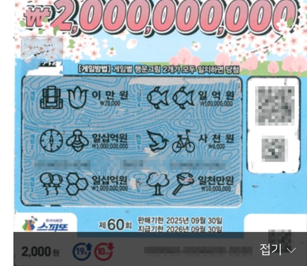| 1등 | 일십억원(1,000,000,000원) | 6매 | 4,000,000,000원 | 1/5,000,000 |
