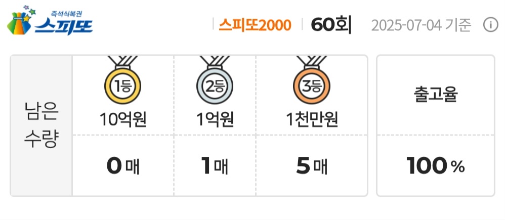 스피또2000 즉석복권 60회 남은수량 1등 0매(총 6매 중), 2등 1매(총 18매 중), 3등 5매(총 150매 중)가 남아있습니다. 출고율(판매점 입고율)은 100%입니다.