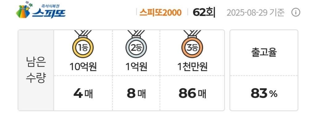 스피또2000 즉석복권 62회 남은수량 1등 4매(총 6매 중), 2등 8매(총 18매 중), 3등 86매(총 150매 중)가 남아있습니다. 출고율(판매점 입고율)은 83%입니다.