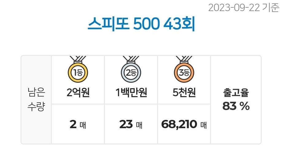 - 스피또500 43회 출고율 / 스피또500 당첨현황(2023.09.22 기준)