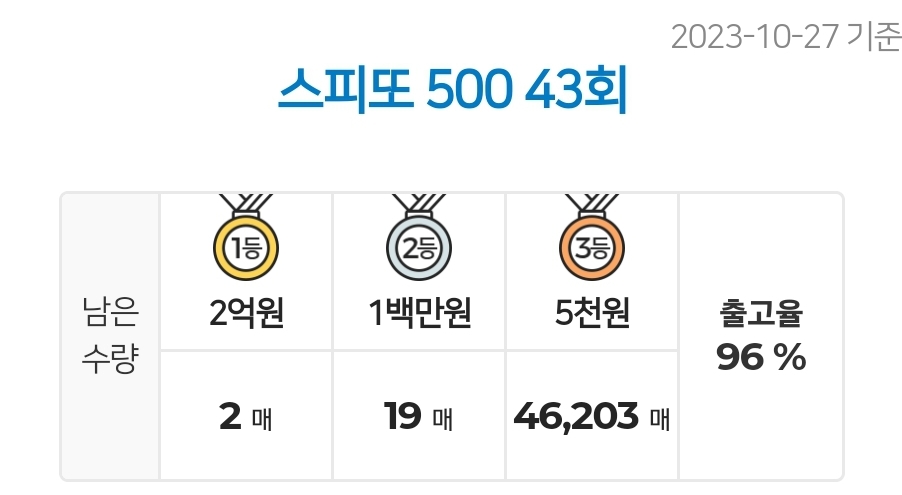 - 스피또500 43회 출고율 / 스피또500 43회 당첨현황(2023.10.27 기준)