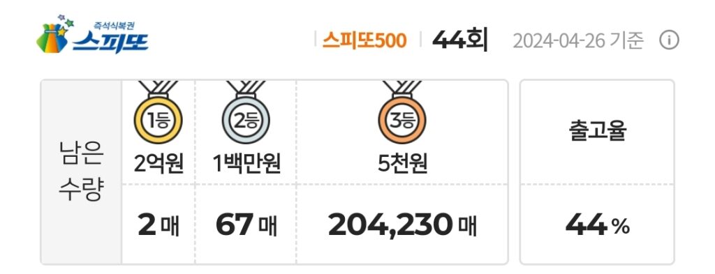 스피또500 44회 1등 남은 수량 및 출고율 정보 및 당첨현황 정보입니다.