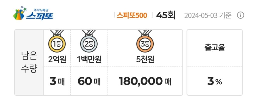 스피또500 복권 45회 남은수량 1등 3매(총 3매 중), 2등 60매(총 60매 중), 3등 180,000매(총 180,000매 중)가 남아 있습니다. 출고율(판매점 입고율)은 3%입니다. 출고율의 의미와 당첨확률을 높이는 방법은 스피또 당첨확율을 높이는 방법은? 구입전에 출고율과 남은 수량을 확인은 필수! 포스팅을 참고하세요.