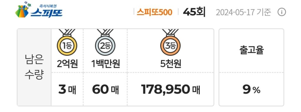 스피또500 45회 1등 남은 수량 및 출고율 정보 및 당첨현황 정보입니다.