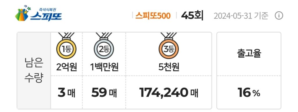 스피또500 45회 1등 남은 수량 및 출고율 정보 및 당첨현황 정보입니다.