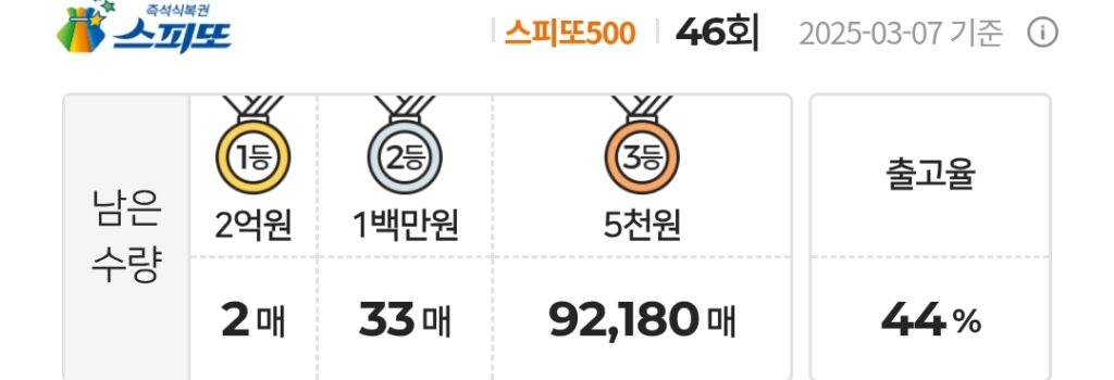 스피또500 46회 1등 남은 수량 및 출고율 정보 및 당첨현황 정보입니다.
