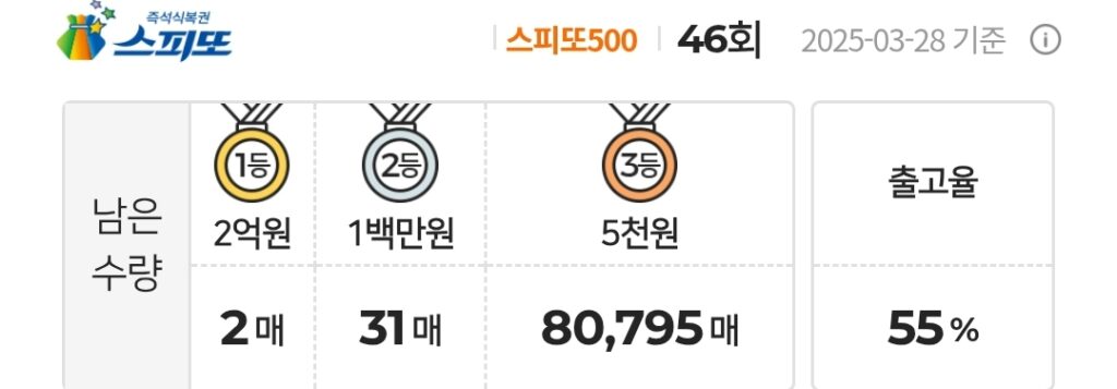 스피또500 46회 1등 남은 수량 및 출고율 정보 및 당첨현황 정보입니다.