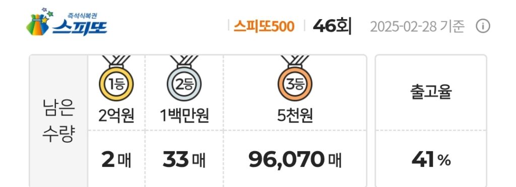 스피또500 46회 1등 남은 수량 및 출고율 정보 및 당첨현황 정보입니다.