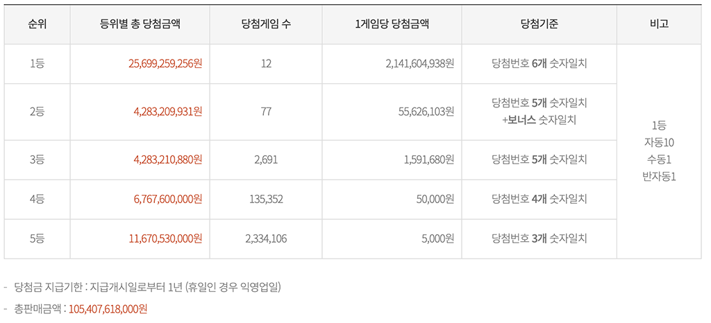 로또 1078회 당첨 게임 수 및 당첨 금액