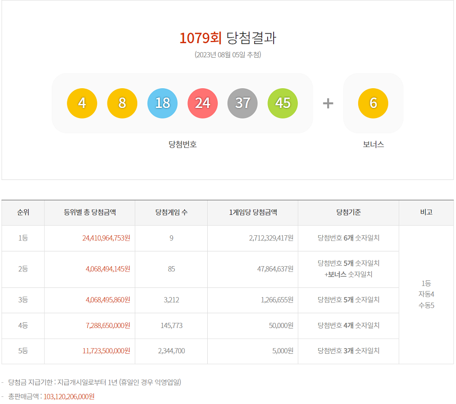 로또 1079회 당첨 게임 수 및 당첨 금액