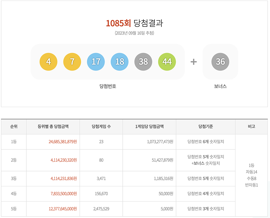 로또 1085회 당첨 로또 번호 및 당첨금액 및 당첨 게임 안내