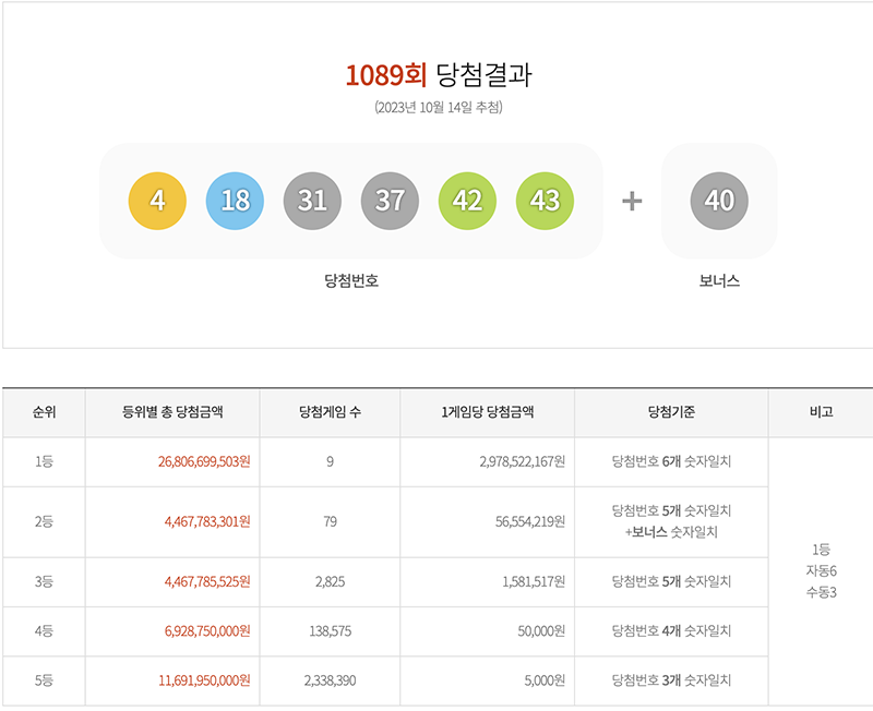 1089회 당첨 로또 번호 및 당첨금액 및 당첨 게임 안내