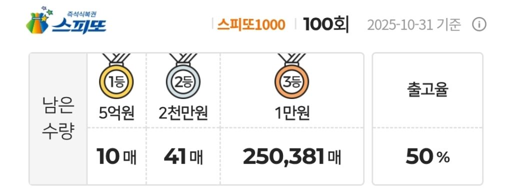 스피또1000 복권 100회 남은수량 1등 10매(총 10매 중), 2등 41매(총 50매 중), 3등 250,381매(총 275,000매 중)가 남아 있습니다. 출고율(판매점 입고율)은 50%입니다.