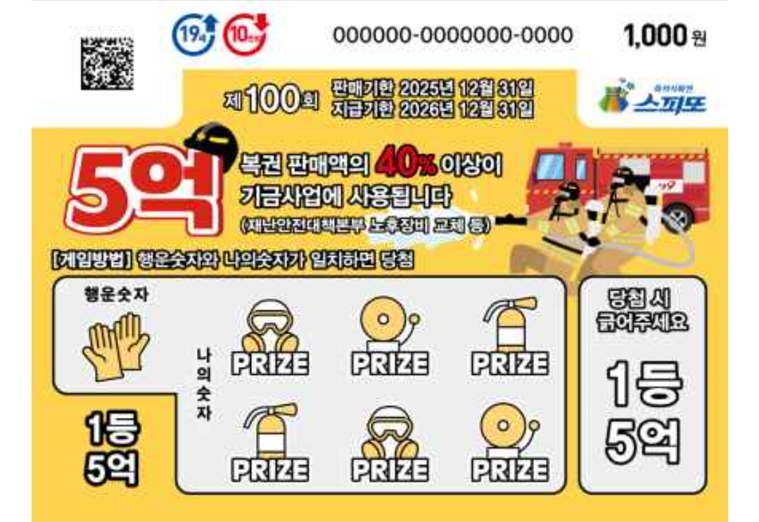 | 1등 | 오억원(500,000,000원) | 9매 | 1/5,000,000 |