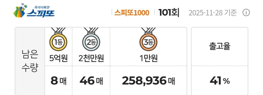 스피또1000 복권 101회 남은수량 1등 8매(총 10매 중), 2등 46매(총 50매 중), 3등 258,936매(총 271,455매 중)가 남아 있습니다. 출고율(판매점 입고율)은 41%입니다.