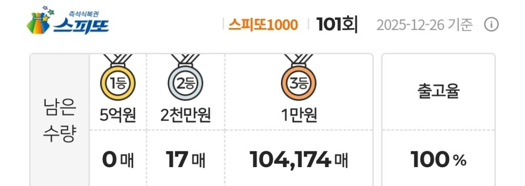 스피또1000 복권 101회 남은수량 1등 0매(총 10매 중), 2등 17매(총 50매 중), 3등 150,622매(총 104,174매 중)가 남아 있습니다. 출고율(판매점 입고율)은 100%입니다.