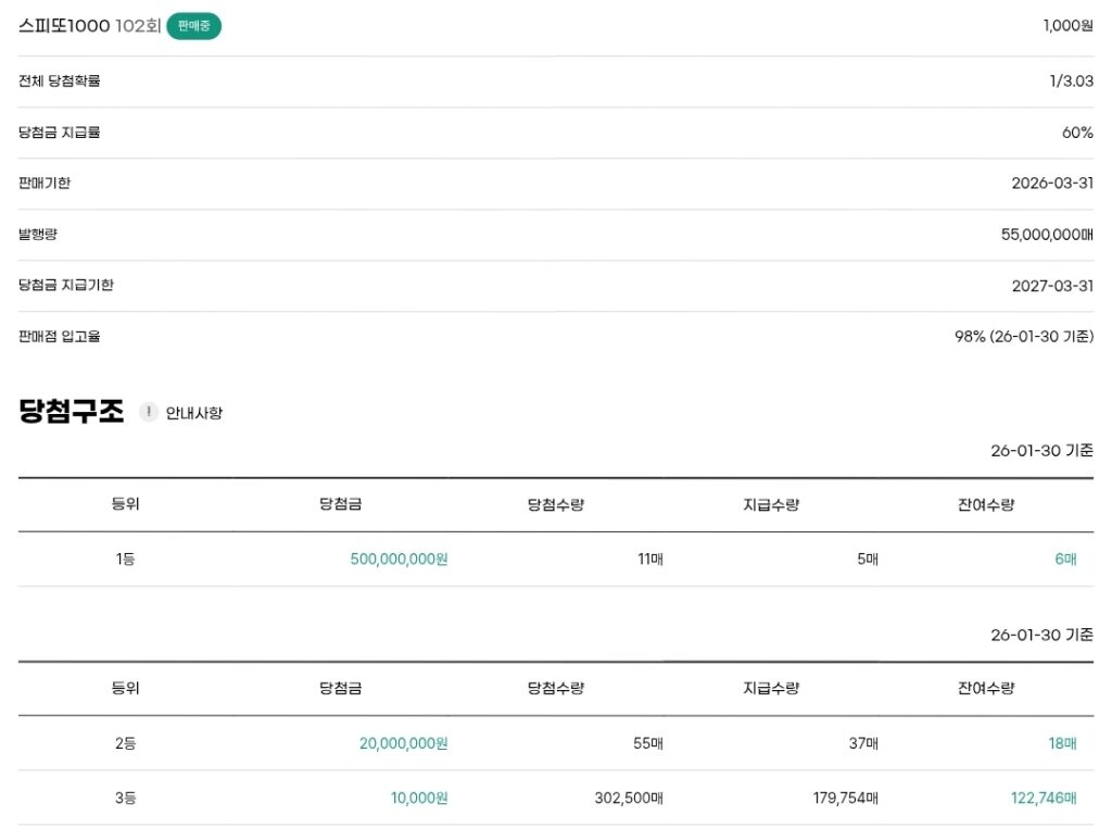 스피또1000 복권 102회 출고율(판매점 입고율)은 98%입니다. 잔여수량은 아래 이미지를 참고하세요.