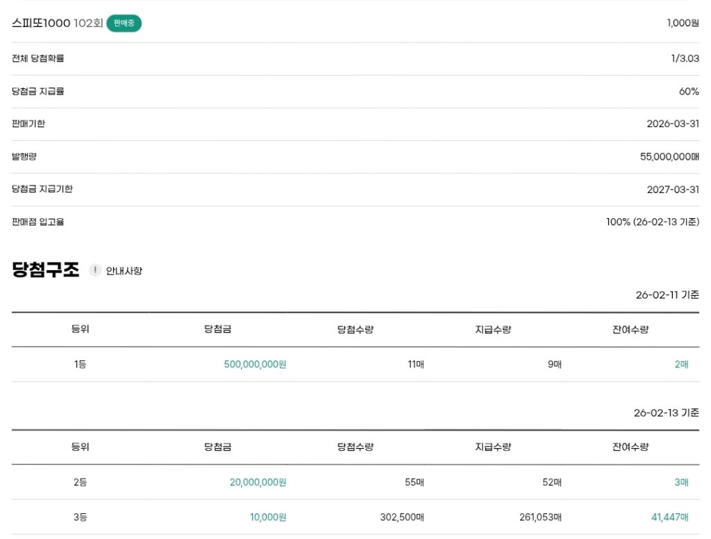 스피또1000 복권 102회 출고율(판매점 입고율)은 100%입니다. 잔여수량은 아래 이미지 당첨구조를 참고하세요.