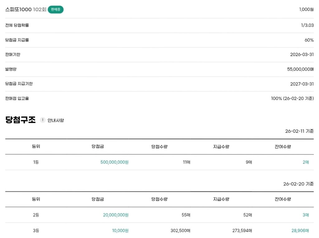 스피또1000 복권 102회 출고율(판매점 입고율)은 100%입니다. 잔여수량은 아래 이미지 당첨구조를 참고하세요.