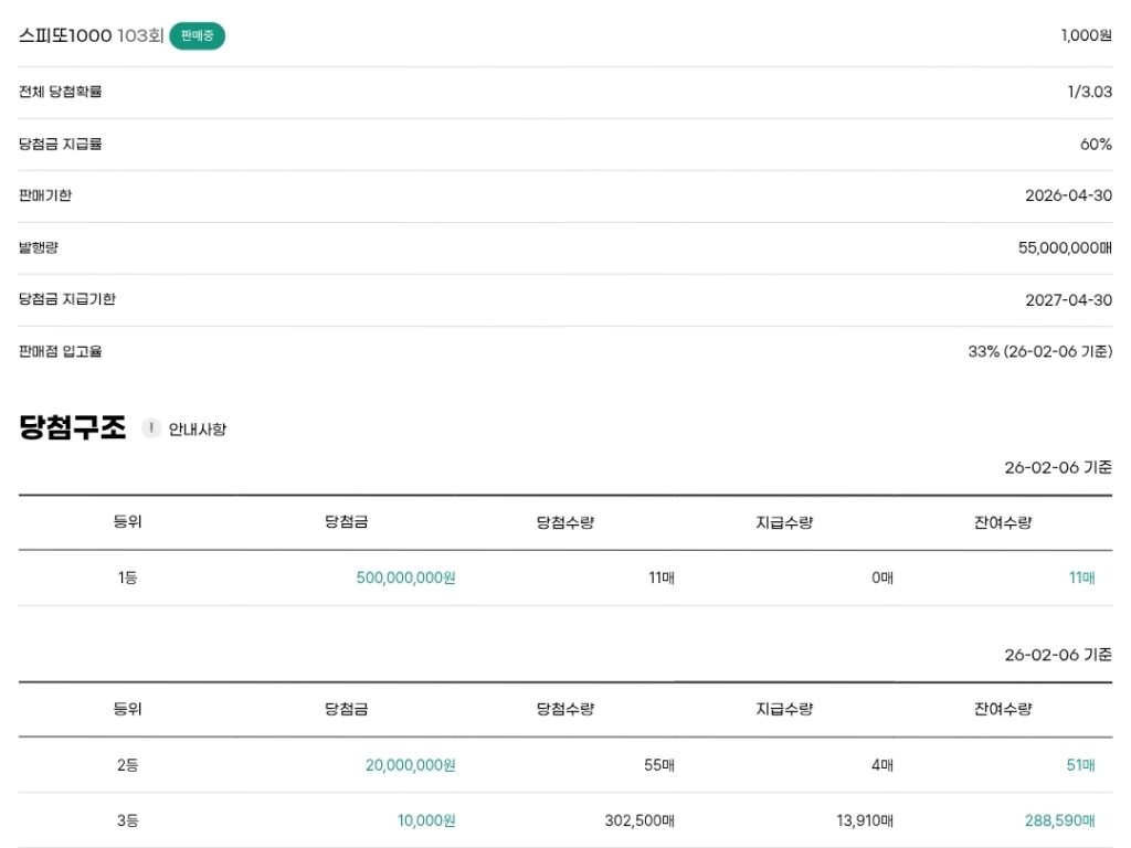 스피또1000 복권 103회 출고율(판매점 입고율)은 33%입니다. 잔여수량은 아래 이미지를 참고하세요.