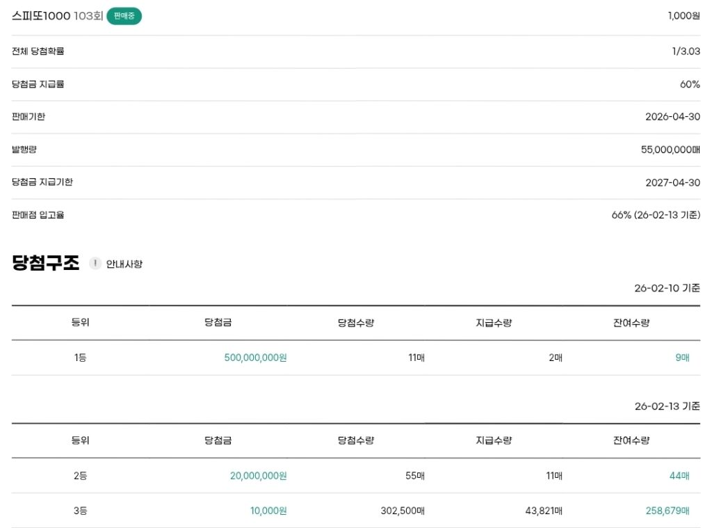 스피또1000 복권 103회 출고율(판매점 입고율)은 66%입니다. 잔여수량은 아래 이미지를 참고하세요.